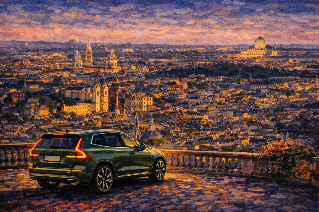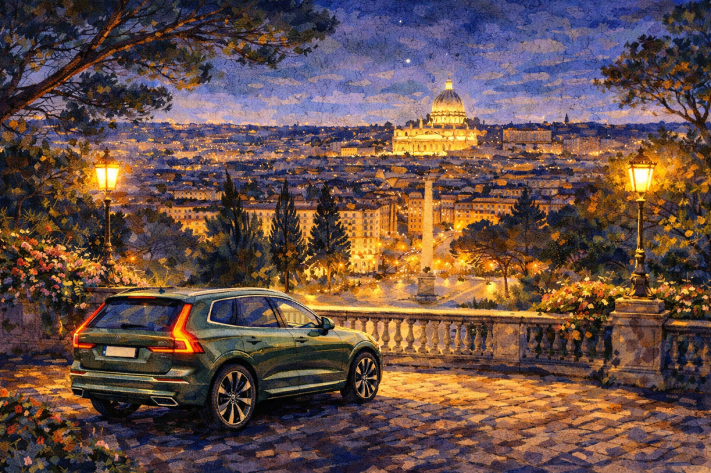 This evening itinerary begins after dinner, around 9:00 pm, when moving through the city becomes fluid again. Over approximately two hours, the journey traces a wide arc across Rome, connecting a sequence of elevated viewpoints that are difficult—often impractical—to experience in such a short time without a car.